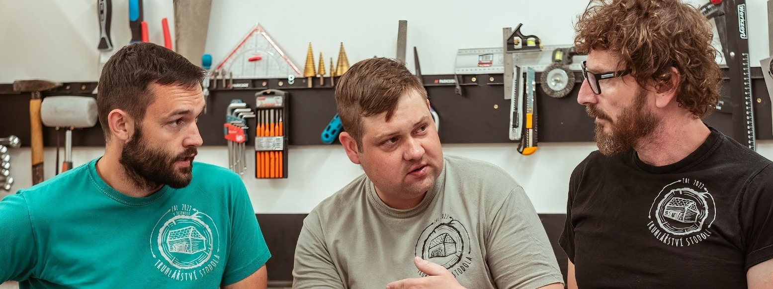 Jsme tři kamarádi Mirek, Roman a Tomáš. Budujeme moderní truhlářství v historickém objektu stodoly z 19. století, která se nachází v obci Jesenice u Rakovníka.